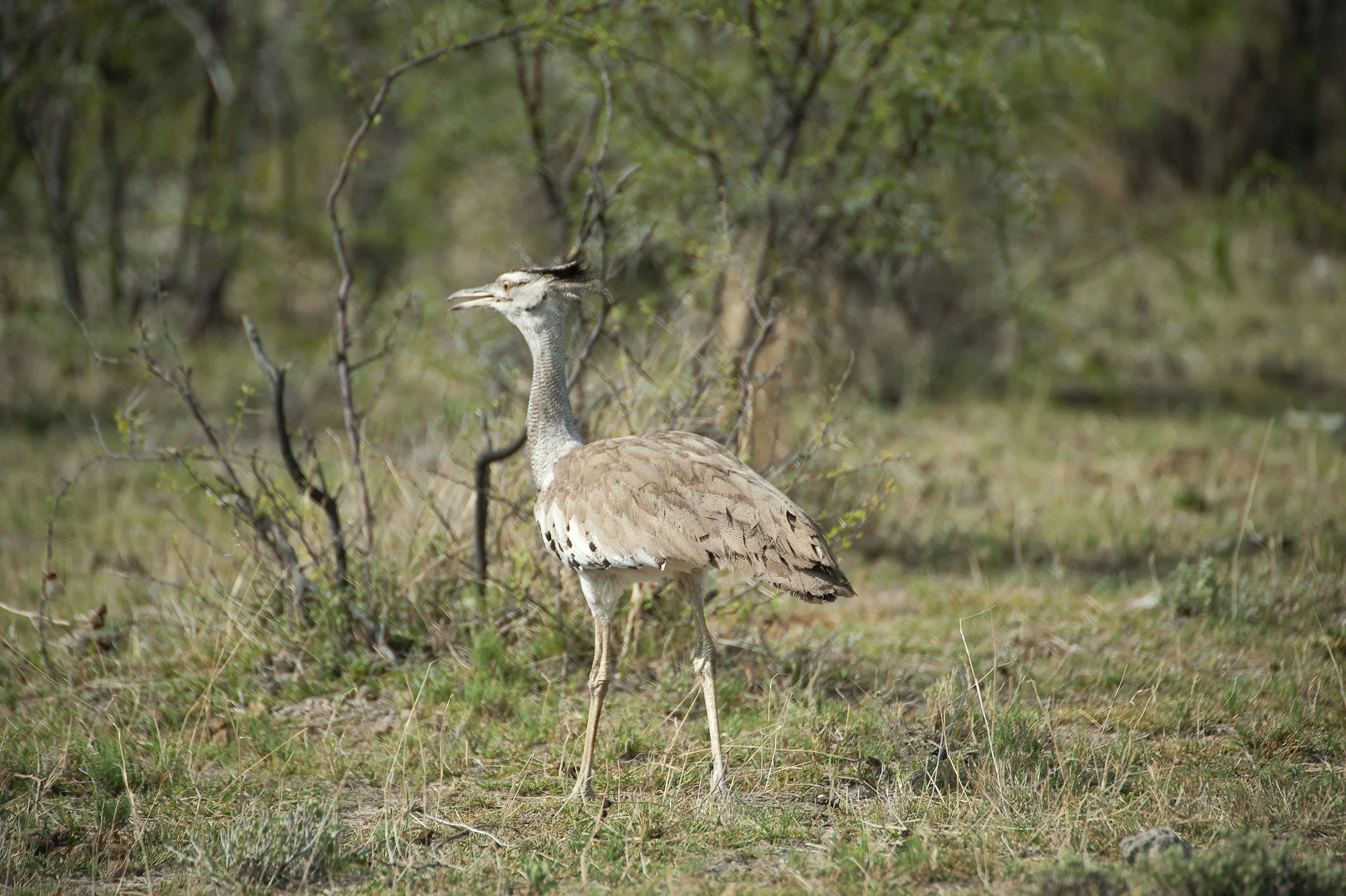 Kori bustards sport a mix of grey and brown plumage, providing perfect camouflage in their grassland homes. A distinctive black crest and white underparts add to their unique appearance.